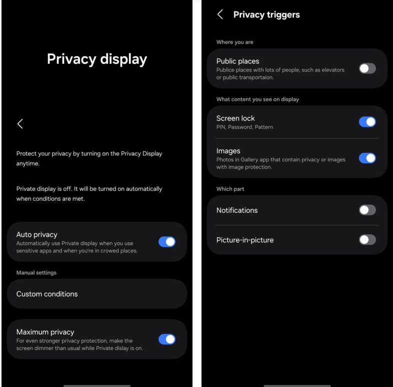 وتشير اللقطات المسربة إلى أن الميزة قد تعتمد على المستشعرات المدمجة وبيانات الموقع لاكتشاف الظروف المحيطة، ثم ضبط إعدادات الشاشة تلقائيًا وفقًا للوضع الحالي، كما ستتيح سامسونج للمستخدمين تخصيص طريقة عمل الميزة وتحديد مستوى الحماية الذي يرغبون به، عبر قائمة خيارات تسمح بتحديد تطبيقات معينة أو ظروف محددة لتفعيلها.