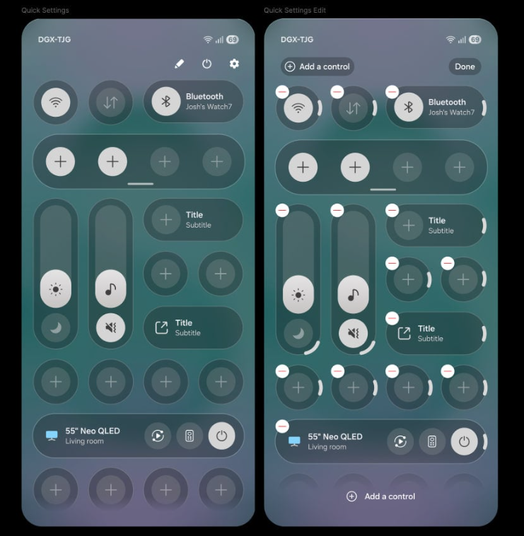 وتُظهر الواجهة تركيزاً على التخصيص الكامل للوحة الإعدادات السريعة، حيث يستطيع المستخدم نقل الأدوات أو تغيير أحجامها أو حتى تعديل ترتيبها بحرية، ما يمنحه تجربة شخصية لا تشبه أي واجهة أخرى.