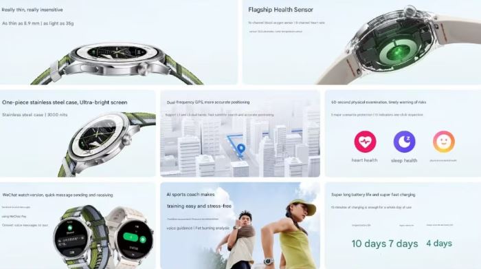 وتتيح الساعة إجراء فحص شامل للجسم خلال 60 ثانية فقط، يغطي ما يصل إلى 13 مؤشراً صحياً مختلفاً، من بينها ضغط الدم ونسبة الأكسجين ومعدل النبض وجودة النوم، كما ترسل تنبيهات فورية في حال رصد أي مؤشرات غير طبيعية.