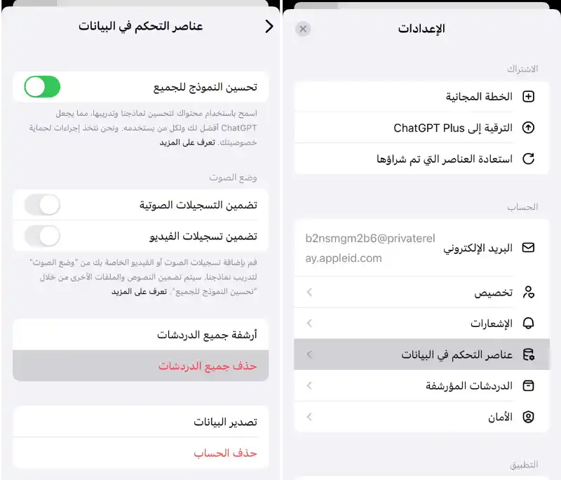 عملية مسح محادثات ChatGPT بالكامل على الحاسوب سهلة للغاية، وتبدأ بتسجيل الدخول إلى موقع ChatGPT ثم الضغط على رمز الملف الشخصي في الأعلى، يلي ذلك الدخول إلى الإعدادات واختيار "عناصر التحكم في البيانات" أو Data Controls، وهناك يمكن النقر على خيار Delete all chats لتأكيد الحذف النهائي، بعد هذه الخطوة، يُزال السجل بالكامل من حسابك ولا يمكن استرجاعه.
