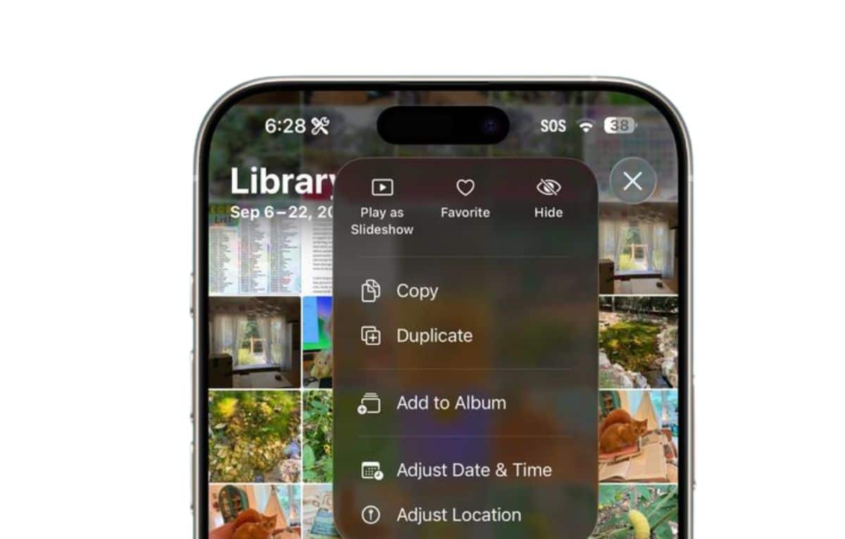 وإلى جانب ذلك، شهد تطبيق الصور (Photos) تحسينات ملحوظة، إذ أصبح شريط التمرير الخاص بتقديم مقاطع الفيديو أكثر سلاسة واستجابة، كما تم تعديل تصميم شريط التنقل ليصبح أوضح على الخلفيات الفاتحة. كما نقلت آبل بعض خيارات إدارة الصور مثل “تشغيل كعرض شرائح” و“المفضلة” و“إخفاء” إلى أعلى القائمة، لتسهيل الوصول إليها وجعل تجربة تصفح الصور أكثر ترتيباً وانسيابية.