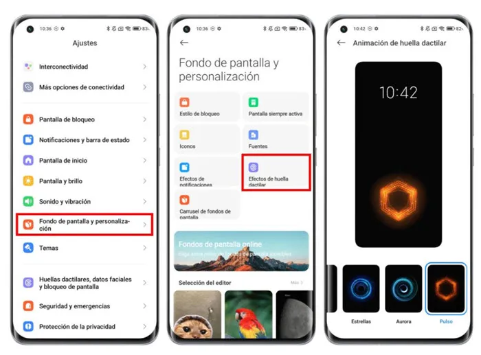 لتغيير تأثير مستشعر البصمة، على المستخدمين فتح الإعدادات والانتقال إلى قسم خلفية الشاشة والتخصيص، ثم اختيار Fingerprint Effects، وستظهر قائمة التأثيرات الأربعة.