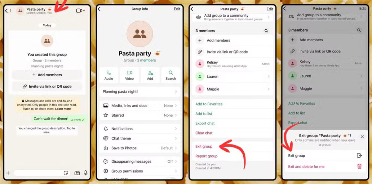 لتنفيذ ذلك، يجب فتح المجموعة، ثم الضغط على اسمها أعلى الشاشة، بعد ذلك التمرير لأسفل صفحة المعلومات واختيار "مغادرة المجموعة" باللون الأحمر، ثم تحديد ما إذا كنت تريد المغادرة فقط أو حذف المجموعة من جهازك أيضًا.