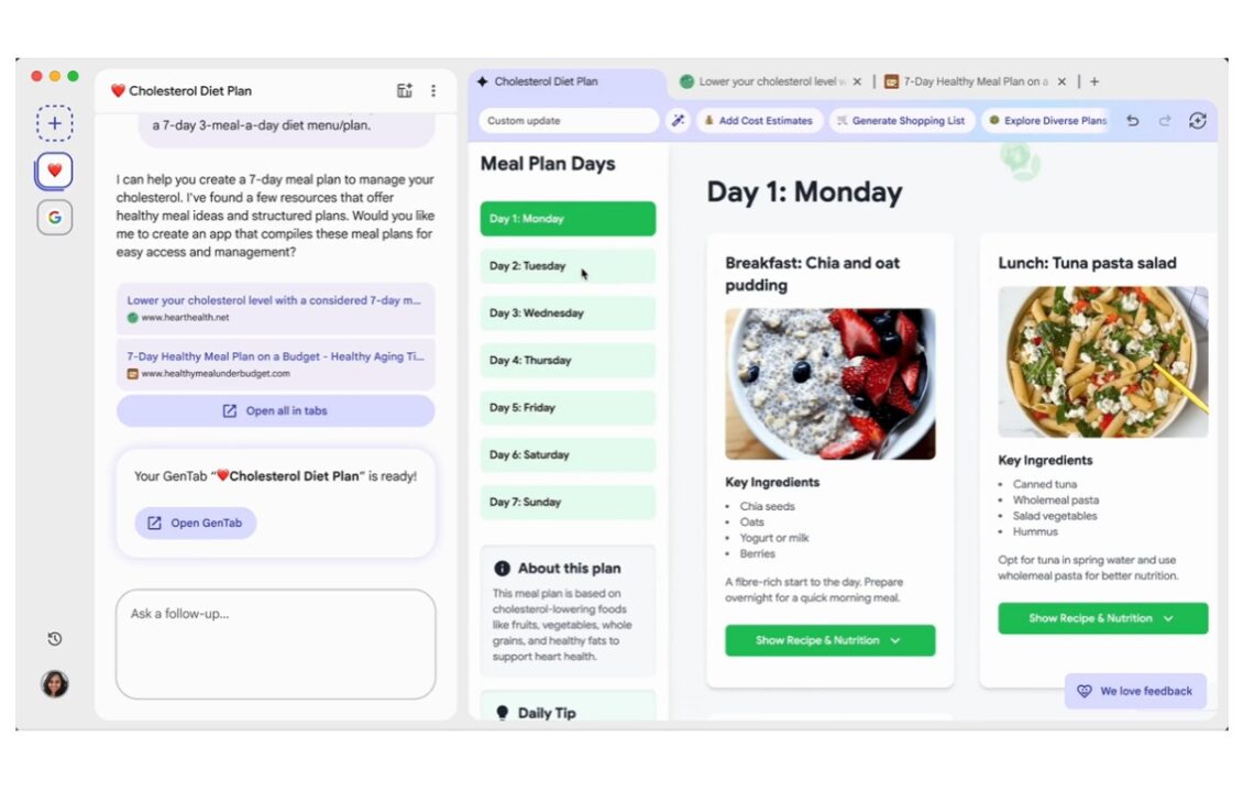 يُنشئ هذا التفاعل منصّة GenTabs التفاعلية، التي تُبنى أمام عيني المستخدم خطوة بخطوة، وليس مجرد رد ثابت أو نهائي، وقالت جوجل إنها لاحظت ميل المستخدمين في التجارب السابقة إلى الاكتفاء بالمحادثة النصية، دون زيارة المواقع الفعلية.
