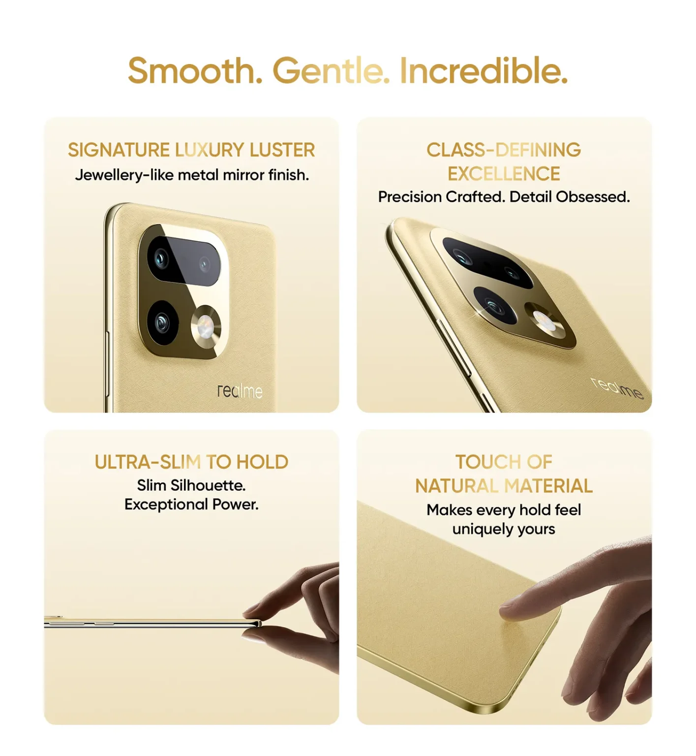 يبرز الهاتف بتصميم خارجي فريد يعكس هوية ريلمي المبتكرة في عالم الهواتف الذكية، حيث تم تدوير وحدة الكاميرات الخلفية بزاوية 90 درجة لتمنحه مظهراً جمالياً غير تقليدي، يسهل التعرف عليه فوراً بين حشود الأجهزة التقليدية التي تزدحم بها الأسواق الحالية.