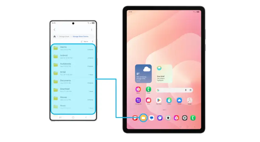 يستطيع المستخدم تفعيل خاصية مشاركة التخزين عبر الانتقال إلى قائمة "Nearby Share"، حيث ستظهر كافة الأجهزة القريبة والمتاحة للاتصال ضمن نطاق الشبكة، مما يتيح عرض الملفات المخزنة على الجهاز الثاني مباشرة، داخل تطبيق "مدير الملفات" الأساسي في الجهاز الأول.