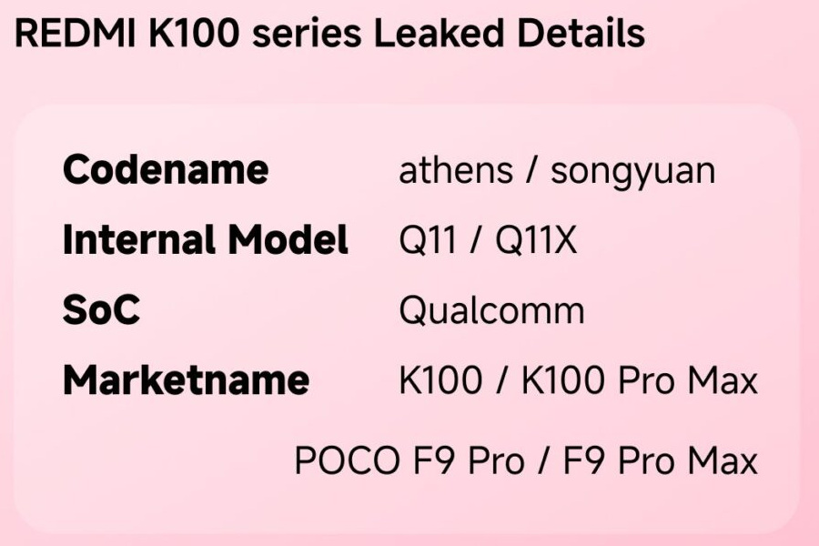 استخرج فريق XiaomiTime تفاصيل دقيقة حول الأسماء الرمزية للأجهزة الجديدة، إذ يحمل هاتف Redmi K100 الاسم الرمزي أثينا مع تسمية داخلية برقم Q11، بينما أطلقت الشركة اسم سونغيوان على النسخة الأقوى K100 Pro Max مع الرمز الداخلي Q11X، مما يشير إلى قفزة هندسية مرتقبة في عام 2026.