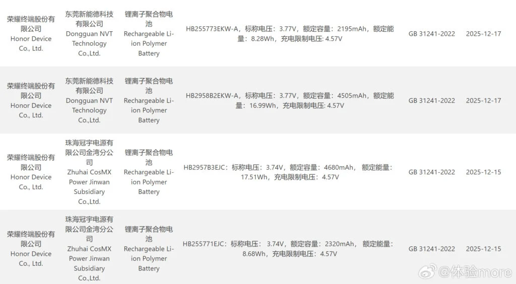 تؤكد التسريبات التقنية التي نشرها المسرب الشهير Experience More أن الهاتف الجديد سيكسر الأرقام القياسية، حيث حصلت بطارية Magic V6 بالفعل على اعتماد هيئة 3C الصينية، لتكون الأضخم في تاريخ الهواتف القابلة للطي عالمياً حتى اللحظة.