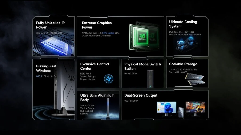 دمجت الشركة بطاقة الرسوميات الحديثة Nvidia GeForce RTX 5070 داخل هذا الهيكل الصغير، لتوفير تجربة بصرية مذهلة تدعم تقنيات تتبع الأشعة والذكاء الاصطناعي الرسومي، وتعتبر هذه البطاقة الخيار الوحيد المتاح في طراز G7 Pro، مما يعكس توجه الشركة نحو تقديم أعلى مستويات الجودة الرسومية الممكنة، دون تقديم أي تنازلات في الأداء الفعلي أثناء العمل الشاق.