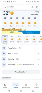 تتضمن الصفحة الجديدة دائرة توقعات قياسية تمتد لمدة 10 أيام كاملة، بالإضافة إلى قوائم منسدلة توضح جودة الهواء ونسب الرطوبة وسرعة الرياح وهطول الأمطار، ولكن هذا الثراء المعلوماتي يأتي مغلفاً في إطار صفحة نتائج ويب قياسية، مما يقلل من جاذبية التصميم وسهولة التعامل معه.