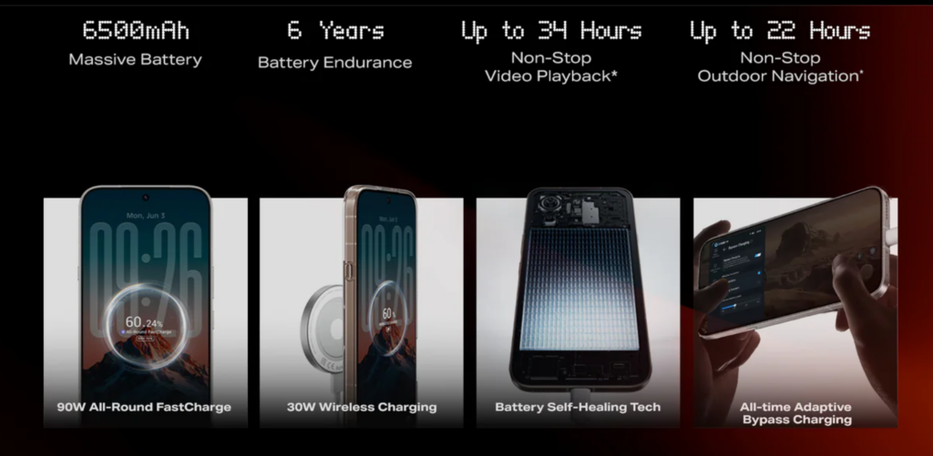 يحتوي Note 60 Pro على بطارية ضخمة بسعة 6,500mAh تدعم الشحن السريع بقدرة 90W، كما يدعم الشحن اللاسلكي بقدرة 30W وتقنية الشحن التجاوزي (bypass charging)، وزودت الشركة الجهاز بمستشعر لمراقبة ضربات القلب ونسبة الأكسجين في الدم عبر تطبيق My Health، مما يجعله أداة صحية ذكية ومتكاملة ترافق المستخدم في كافة نشاطاته اليومية.